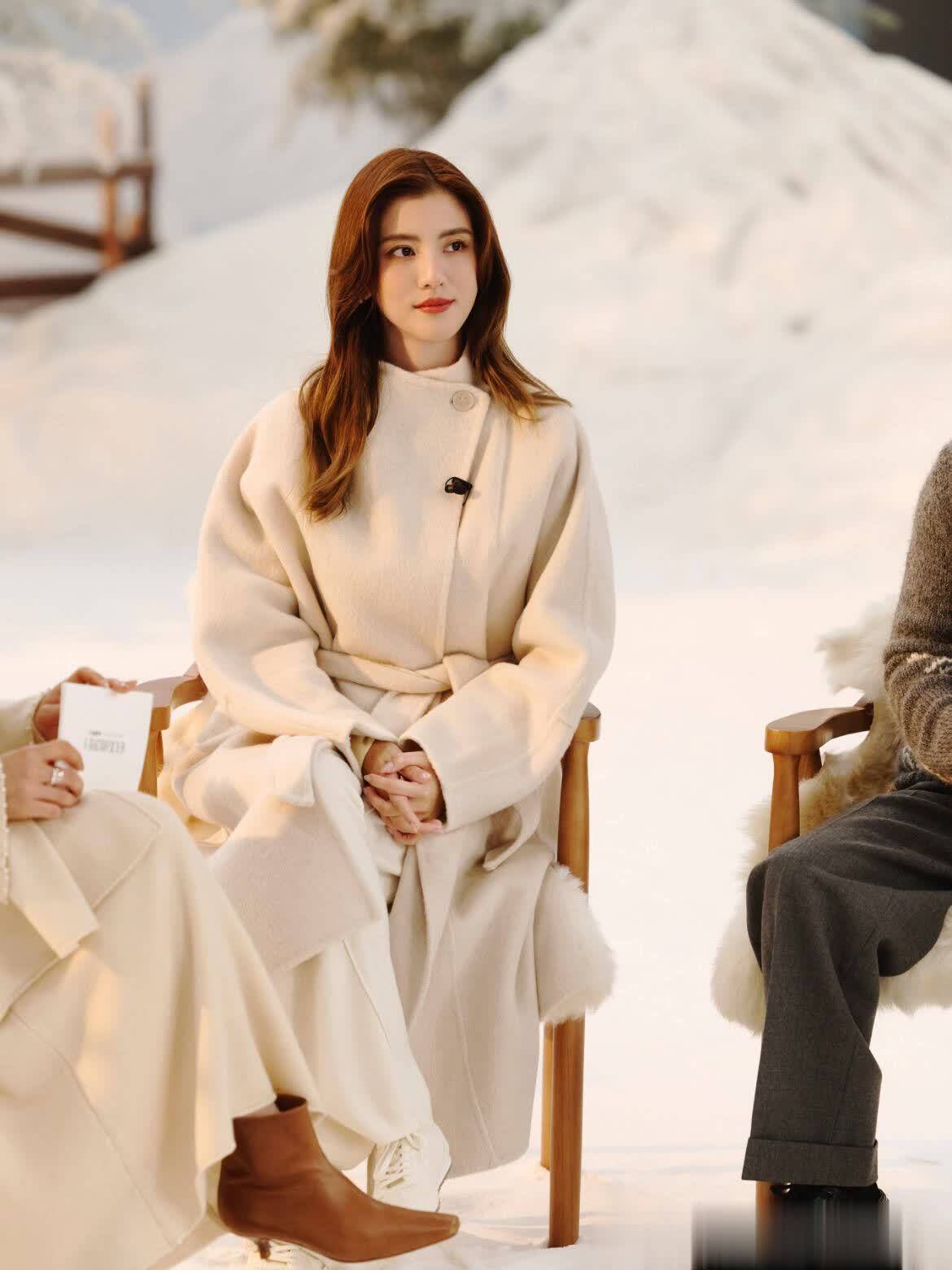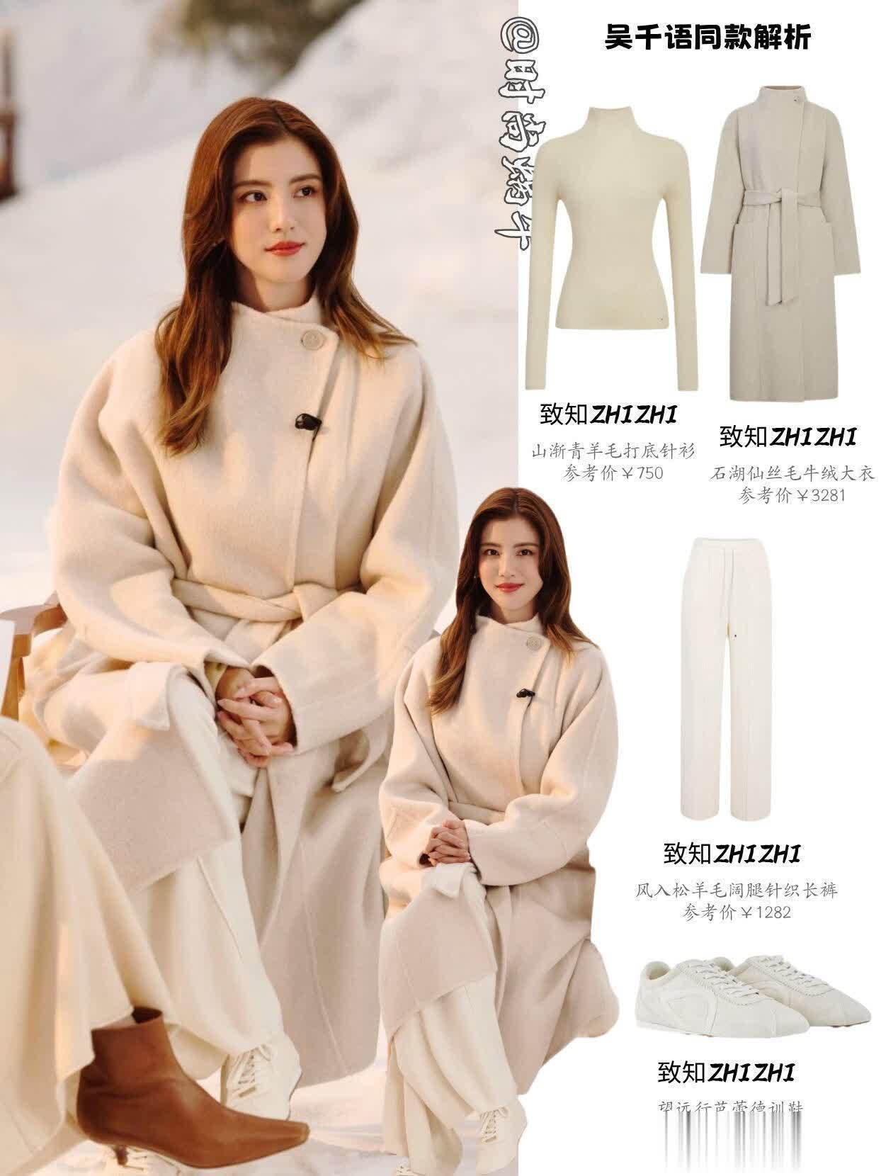 吴千语这波老钱风穿搭真的是把精髓拿捏得死死的!你看她那件白色丝毛牛绒大衣,看着就沉甸甸的有质感,不是那种轻飘飘的料子,垂坠感绝了,长度刚好到小腿肚,既不压个子,走路的时候衣摆带起来的弧度都透着股漫不经心的贵气。里面配的同色系针织裤更绝,裤脚是微喇的,刚好盖住小白鞋的鞋跟,整个线条从肩膀顺到脚面,流畅得像用尺子画出来的,哪有什么挑身材的说法?我这种梨形身材跟着穿,胯宽的地方被大衣挡得严严实实,腿看着直溜溜的,自信心一下就上来了。