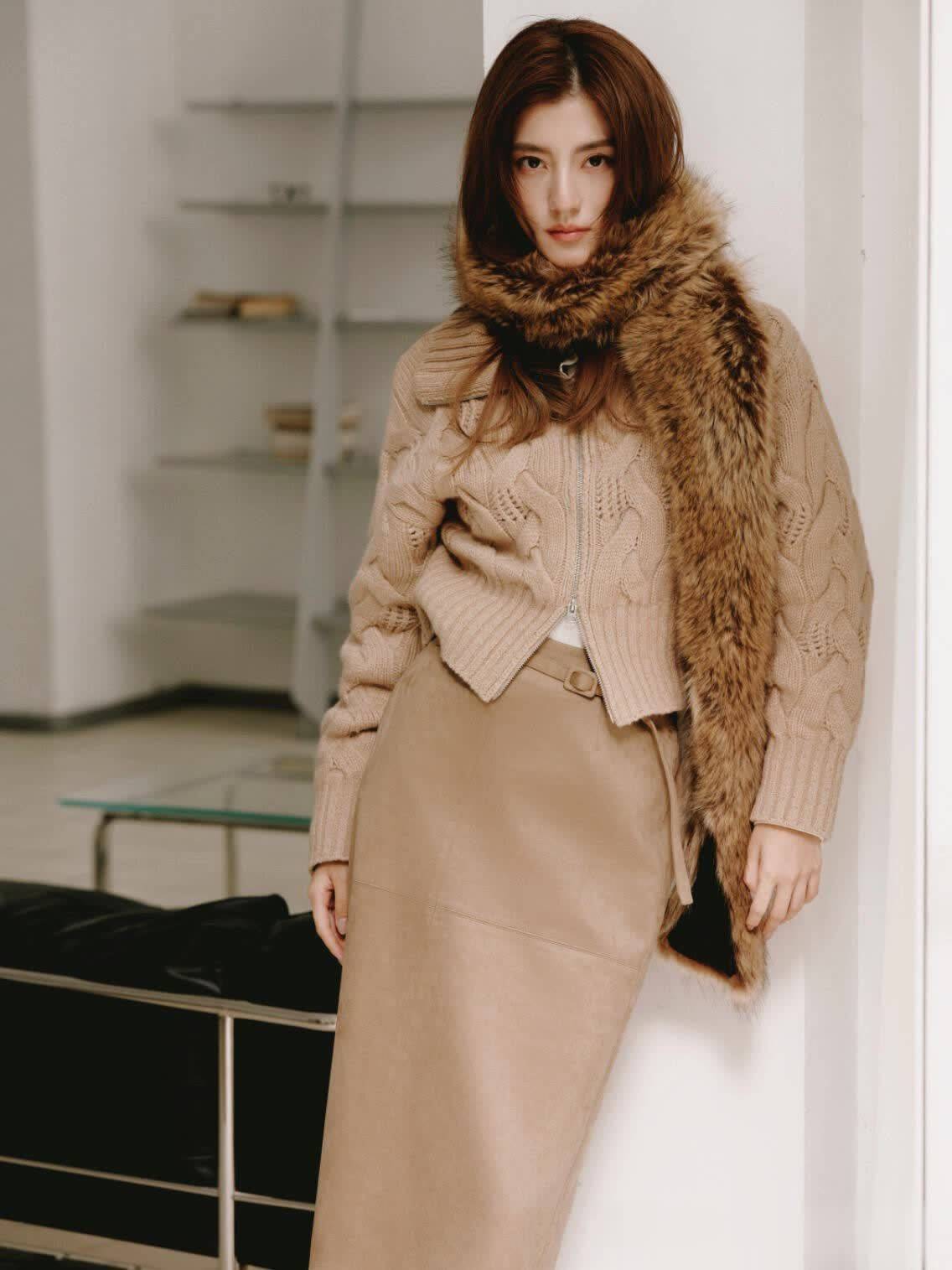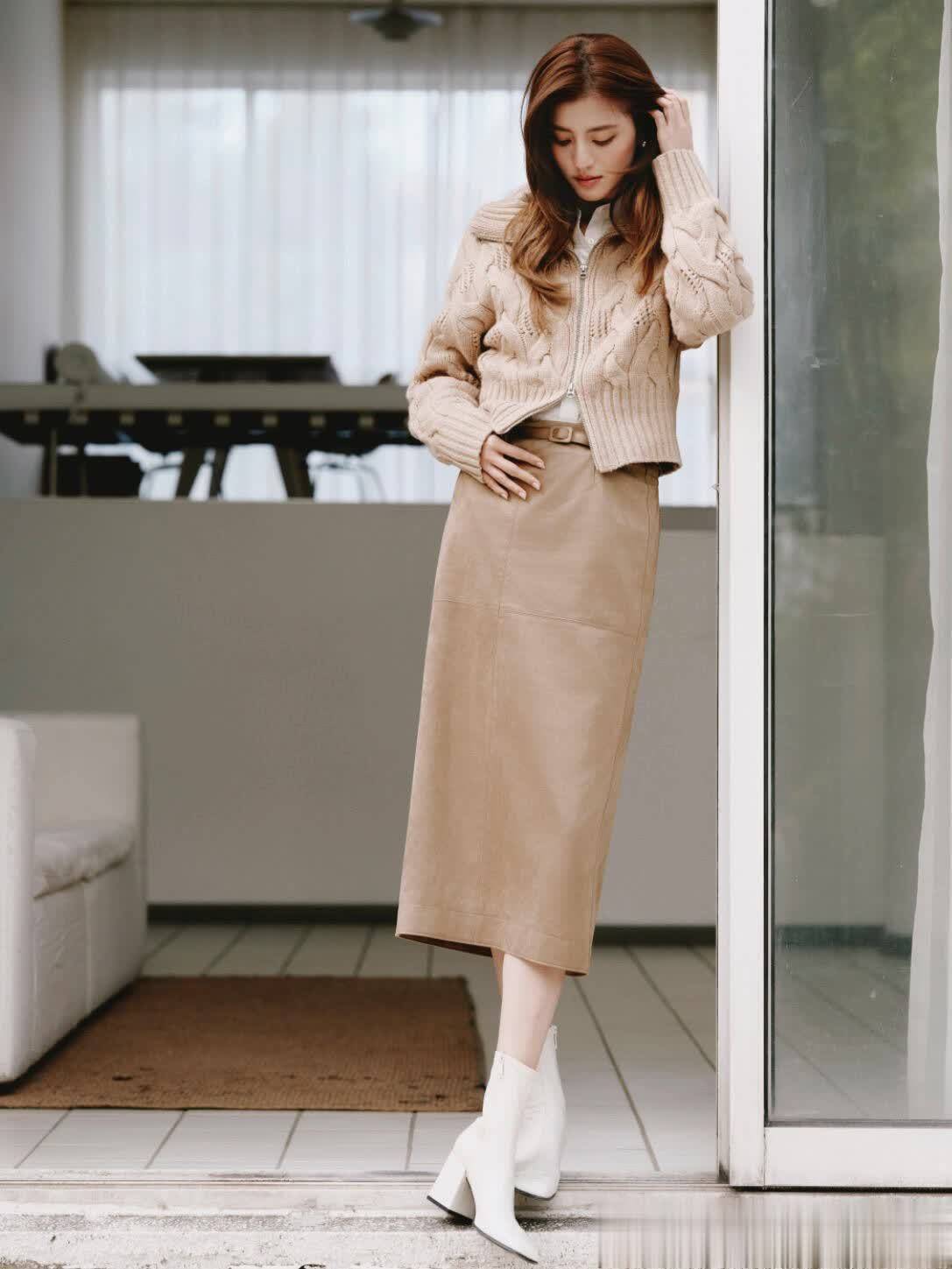 再看那套驼色毛衣配半裙,毛衣是那种糯叽叽的质感,一看就知道是好羊毛,贴身穿肯定舒服,领口随意卷了两圈,露出一点点锁骨,不刻意但就是好看。半裙是A字的,长度到膝盖上面一点,走路的时候裙摆轻轻晃,配上她手里那个棕色皮质手提包,复古又精致,说是留洋千金谁不信啊?关键是这两套都不用费脑子搭配饰,她就戴了块简单的小金表,连项链都没戴,反而显得更高级。